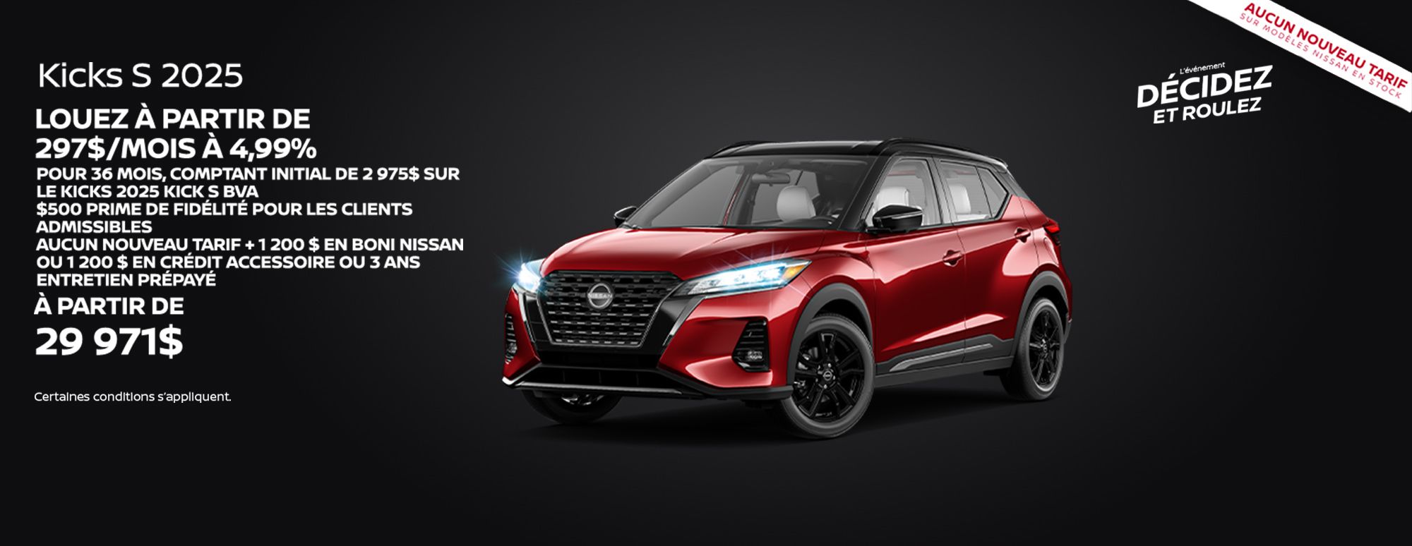L'offre d'achat au comptant est basée sur le modèle 2025 NISSAN Kicks SV PRIVILÈGE TI (V5CG15 42d7065e88cf), avec moteur 2L 4 cyl. et transmission CVT. Le prix de vente à l'achat au comptant est de 32 300,00 $ (plus taxes). Le prix de vente (32 300,00 $) à l'achat au comptant inclut les rabais: Remise pour Achat Comptant (2 000,00 $). Le prix de vente (32 300,00 $) à l'achat au comptant inclut: Transport et Préparation (2 030,00 $), Frais d'administration (621,00 $), Taxe d'accise sur le climatiseur (100,00 $) installation comprise. Plus (TPS/TVQ) et immatriculation. L'offre de financement est basée sur le modèle 2025 NISSAN Kicks SV PRIVILÈGE TI (V5CG15 42d7065e88cf), avec moteur 2L 4 cyl. et transmission CVT. Le prix de vente en financement est de 34 300,00 $ (taxes en sus). Les paiements en financement incluent: Transport et Préparation (2 030,00 $), Frais d'administration (621,00 $), Taxe d'accise sur le climatiseur (100,00 $), RDPRM (86,00 $) installation comprise. L'offre de financement est basée sur un terme de 84 mois avec un taux d'intérêt de 3,99%. Les 364 paiements à la semaine de 108,24 $ (124,45 $ taxes incluses) incluent un acompte de 0,00 $ et un échange net de 0,00 $. Les acomptes sont dus à la livraison du véhicule. Les crédits de taxes pour l'échange sont soumis à une preuve de propriété. L’obligation totale en financement est de 45 299,80 $ (taxes comprises). Les frais de crédit totaux en financement sont de 7 777,37 $. Le taux annuel en pourcentage (TAP) est de 5,62%. Offre de financement d'une periode limitée sur approbation de crédit. Les taux et les exigences peuvent varier en fonction de la solvabilité. Les paiements et conditions peuvent différer pour une utilisation commerciale. Certains client ne pourront se qualifier. Les taxes applicables sont calculées sur le montant total avant déduction de l'acompte. L'offre de location est basée sur le modèle 2025 NISSAN Kicks SV PRIVILÈGE TI (V5CG15 42d7065e88cf), avec moteur 2L 4 cyl. et transmission CVT. Le prix de vente en location est de 34 300,00 $ (taxes en sus). Les paiements en location incluent: Transport et Préparation (2 030,00 $), Frais d'administration (621,00 $), Taxe d'accise sur le climatiseur (100,00 $) installation comprise. Les paiements en location excluent: RDPRM (86,00 $). L'offre de location est basée sur un terme de 60 mois avec un taux d'intérêt de 3,99%. Les 260 paiements à la semaine de 105,53 $ (121,34 $ taxes incluses) incluent un acompte de 0,00 $ et un échange net de 0,00 $. Les acomptes sont dus à la livraison du véhicule. L'acompte de 0,00 $ et la taxe sur l'acompte, l'échange net de 0,00 $ et le premier paiement de 121,34 $ sont dûs au début du bail. Le montant total dû au début du bail est 220,22 $ (Acompte de 0,00 $, Premier paiement (121,34 $), RDPRM (86,00 $) et (TPS/TVQ) 12,88 $). Les crédits de taxes pour l'échange sont soumis à une preuve de propriété. L'offre de location est basé sur un plan de kilométrage de 20000 km par année. Des frais de 0,10 $ par kilomètre supplémentaire seront applicables. La valeur résiduelle estimée est de 11 416,86 $. Une option d'achat à la fin de la location pourrait être disponible (Valeur de Rachat) au montant de 11 416,86 $. Un dépôt de sécurité pourrait être requis. Offre de location d'une periode limitée sur approbation de crédit. Les taux et les exigences peuvent varier en fonction de la solvabilité. Les paiements et conditions peuvent différer pour une utilisation commerciale. Certains client ne pourront se qualifier. Les taxes sur le comptant initial et les rabais après taxes (incluant les rabais du gouvernement) sont exclues et doivent être payées à la livraison. L’obligation totale en location est de 31 647,28 $ (taxes comprises). Les frais de crédit totaux en location sont de 6 554,66 $. Le taux annuel en pourcentage (TAP) est de 0,25%. Le véhicule illustré est basé sur le modèle 2025 NISSAN Kicks SV PRIVILÈGE TI (V5CG15 PR00), avec moteur 2L 4 cyl. et transmission CVT.. Le prix de vente à l'achat au comptant du véhicule illustré est de 32 300,00 $. Droits et autres frais environnementaux, immatriculation, assurance, enregistrement, options additionnelles et taxes applicables sont en sus. Bien que tous les efforts raisonnables soient faits pour assurer l'exactitude de ces informations, nous ne sommes pas responsables des erreurs ou omissions contenues sur ces pages. S'il vous plaît vérifier toutes les informations et les prix avec un représentant des ventes ou demander en ligne. Le concessionnaire se réserve le droit de faire des modifications aux prix, aux taux, aux modèles, aux matériaux, aux équipements, aux caractéristiques et aux disponibilités ou d'interrompre la production de tout modèle ou tout équipement, à tout moment et sans préavis. Les véhicules d'échange dépendent de l'approbation du concessionnaire. Les crédits de taxes pour l'échange sont soumis à une preuve de propriété.